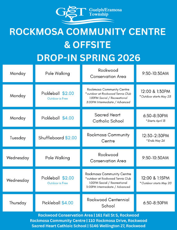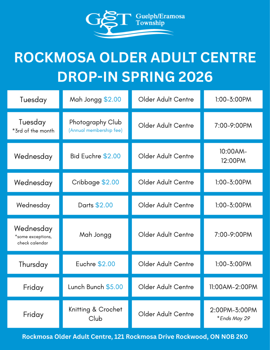 For 2026 you can enjoy all the benefits of membership in the Rockmosa Older Adult Centre for just $33.90. If you are renewing your membership, the cost is only $24.86. For more information please call 519-856-9596 ext. 139 or email programming@get.on.ca.