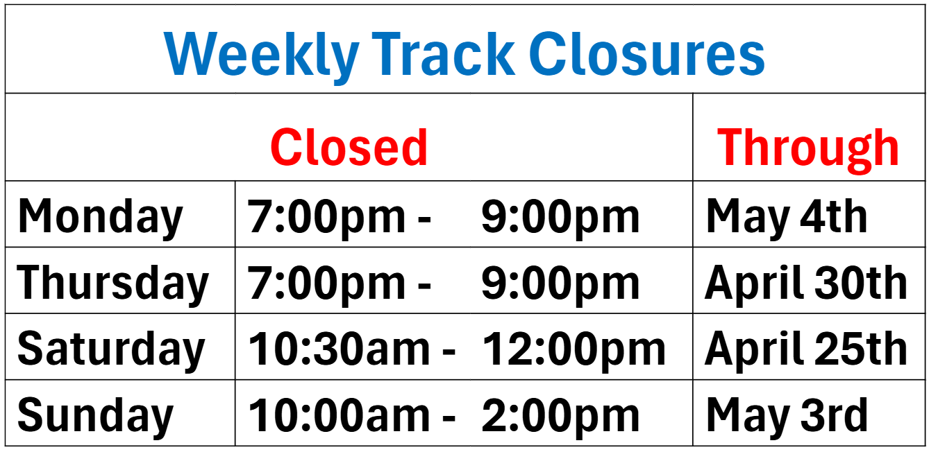 Track Clubs/Groups: For the safety and courtesy of our facility users, organized and/or coached track groups are not permitted to use the track during public use hours. Exclusive use track time slots can be booked by contacting Dave at dnichol@get.on.ca or 519-856-9596 ext. 202